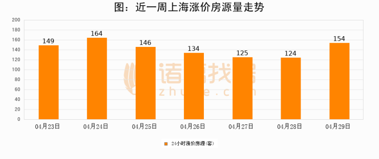 根据诸葛找房数据显示,上海24小时涨价房源量为154套,较04月28日增加30套,环比上涨24.2%。与此同时,涨价房源占比小幅扩大,业主信心有所提升。