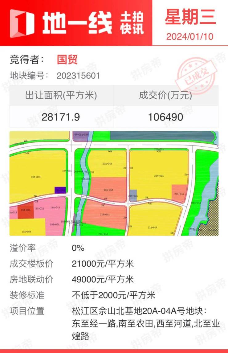 今日成交的还有松江区佘山北基地20A-04A号地块,由国贸以10.649亿元底价竞得,楼板价约21000元/平方米,房地联动价49000元/平方米,装修标准不低于2000元/平方米。