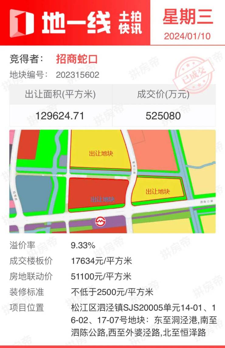 2019年底,招商蛇口曾以15.5137亿元总价竞得松江区泗泾镇SJSB0003单元11-01号地块,成交楼板价21500元/平方米,即后来的9号公馆。