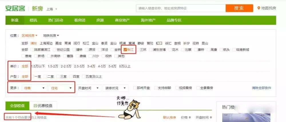 我们在线上对张江进行了一次限定条件极少的搜索,条件是:
