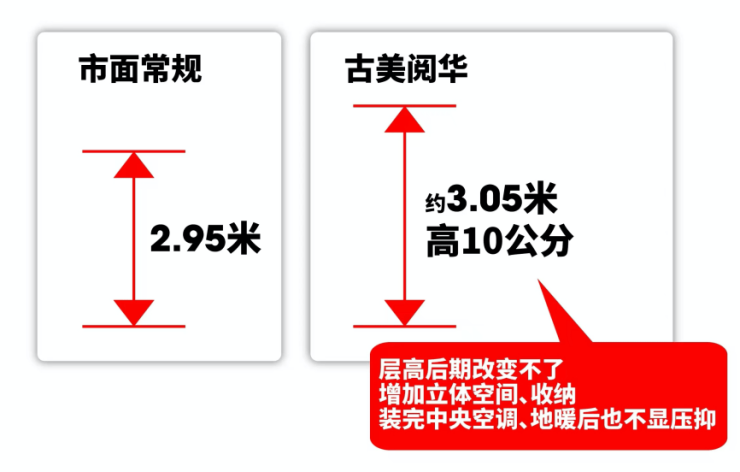 古美阅华的层高做到了约3.05米,比普通新房要多出10公分的空间,同面积段产品,古美阅华的空间更加宽敞,收纳使用面积更多。