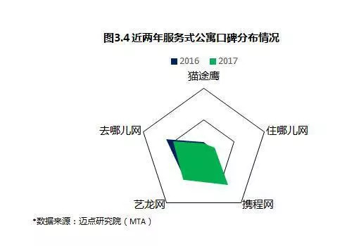 在具体观察服务式公寓口碑分布数据后,我们发现,2017年消费者在去哪儿网上的点评量有较大幅度的提高,在携程和艺龙网两大OTA的点评量则小幅增加,点评量的头部市场趋势更加明显。猫途鹰和住哪儿网等第二梯队的点评数量则几乎没有增长。