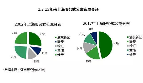 而从服务式公寓的具体分布来看,15年来也出现了巨大变迁。21世纪初,上海服务式公寓逾半数集中在黄埔、长宁两地;较新的统计数据则显示,目前的服务式公寓则主要集中在浦东新区,黄埔及长宁两地占比下降明显。城市商圈的发展,与服务式公寓的布局高度匹配。