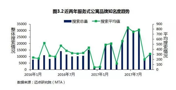 2017年服务式公寓品牌整体搜索情况有所提升,特别是在5月之后,搜索总量较2016年同期增长逾一倍;搜索平均值方面,较去年也有所增加,特别是在6、7、8三个月,搜索平均值较去年同期均有一倍以上的增长。2017年年中以来,多地政府推出了一系列积极鼓励公寓发展的政策措施,民众对于服务式公寓的关注度和期待值也陡然增加。