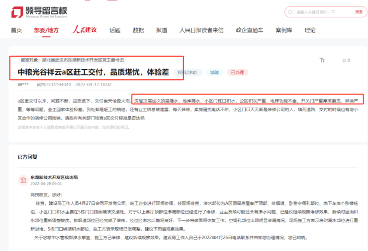 例如去年中粮光谷祥云被爆出来房屋顶层加次顶层漏水,地库漏水,小区门栋口积水,公区积灰严重,电梯功能不全,开关门严重摩擦磨损,异响严重等问题;