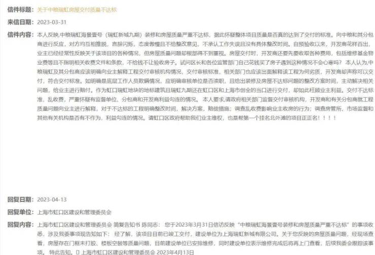 其实早在今年三月底,就已经有业主爆出中粮瑞虹海景壹号可能存在装修和房屋质量严重不达标的问题,该业主向中粮和其分包商反应后,表示双方均相互推脱,言辞闪烁,态度傲慢且不给整改意见,不承认工作失误且没有具体整改时间。