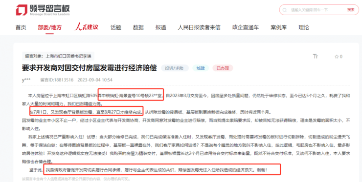 留言板内容显示,该业主居住在中粮瑞虹海景壹号小区,今年7月1日发现房间客厅背景板有发霉现象,而且该小区内出现发霉现象的房子不止一户。
