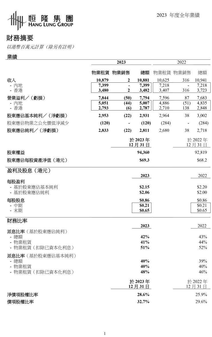 恒隆地产:2023年营收103.2亿港元 物业租赁收入上升3%