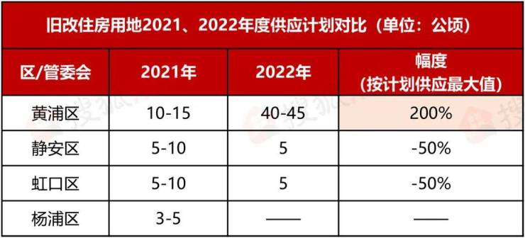 市中心黄浦区和虹口区商品住房用地零供应,旧改住房用地分别供应40-50公顷、5公顷。