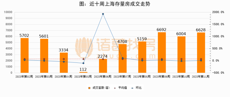 存量房方面,第11周上海存量房成交6628套,较上周增加624套,环比上涨10.4%。从近十周成交走势来看,周均成交套数为4621套,本周高于平均水平43.4%。