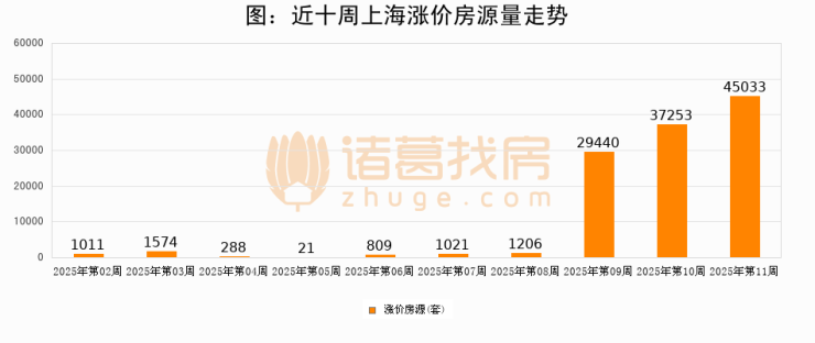 从调价房源来看,第11周上海涨价房源45033套,较上周上涨20.9%。与此同时,11周涨价房源占比提升23.81个百分点,业主信心持续恢复。
