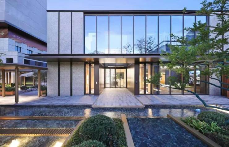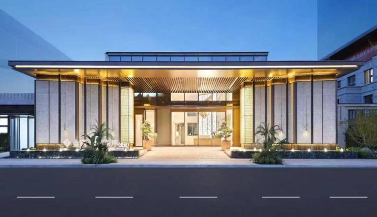 鎏金门头大量使用奢石,结合两侧精致的水景,营造出一种五星级酒店般的入口氛围。