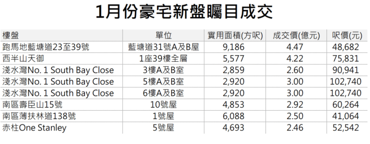 恒隆地产发展的跑马地蓝塘道23至39号,上月亦沽出31A及B号相连大屋,实用面积共9186方尺,成交价近4.5亿元,尺价48682元,成月内最大宗豪宅成交。
