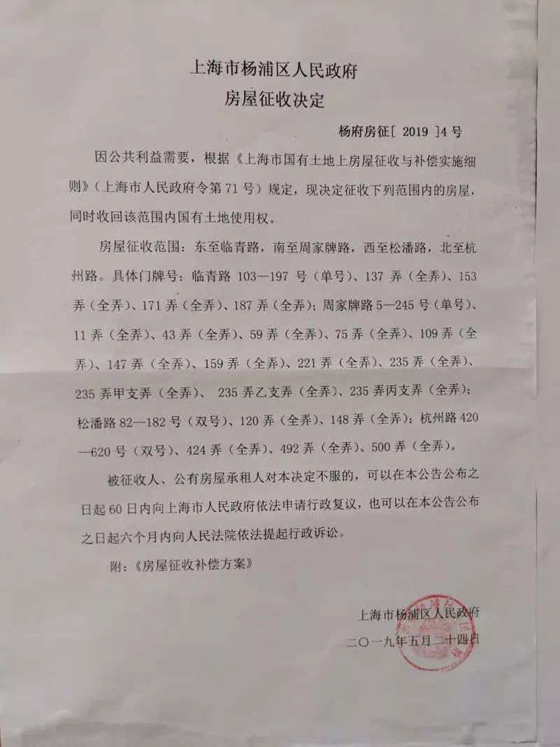5月24日上午,在居委干部及现场居民全程见证,大桥90街坊征收基地的工作人员在基地公示区域内张贴《上海市杨浦区人民政府房屋征收决定》以及《杨浦区90街坊旧城区改建地块房屋征收补偿方案》,大桥90街坊基地的房屋征收工作正式启动。
