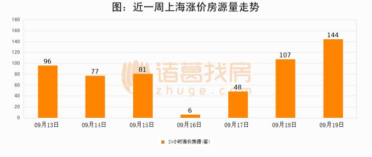 根据诸葛找房数据显示,上海24小时涨价房源量为144套,较09月18日增加37套,环比上涨34.6%。与此同时,涨价房源占比小幅扩大,业主信心有所提升。