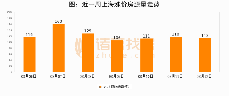 根据诸葛找房数据显示,上海24小时涨价房源量为113套,较08月11日减少5套,环比下降4.2%。与此同时,涨价房源占比小幅回落,对于购房者来说是一个入市窗口期,购房者可抓住时机入市。