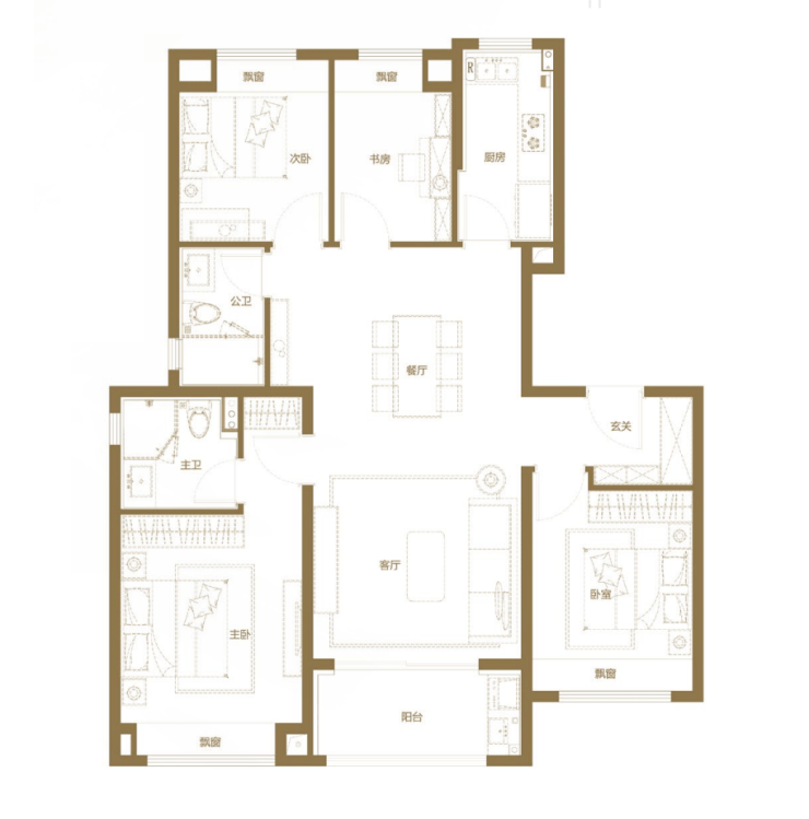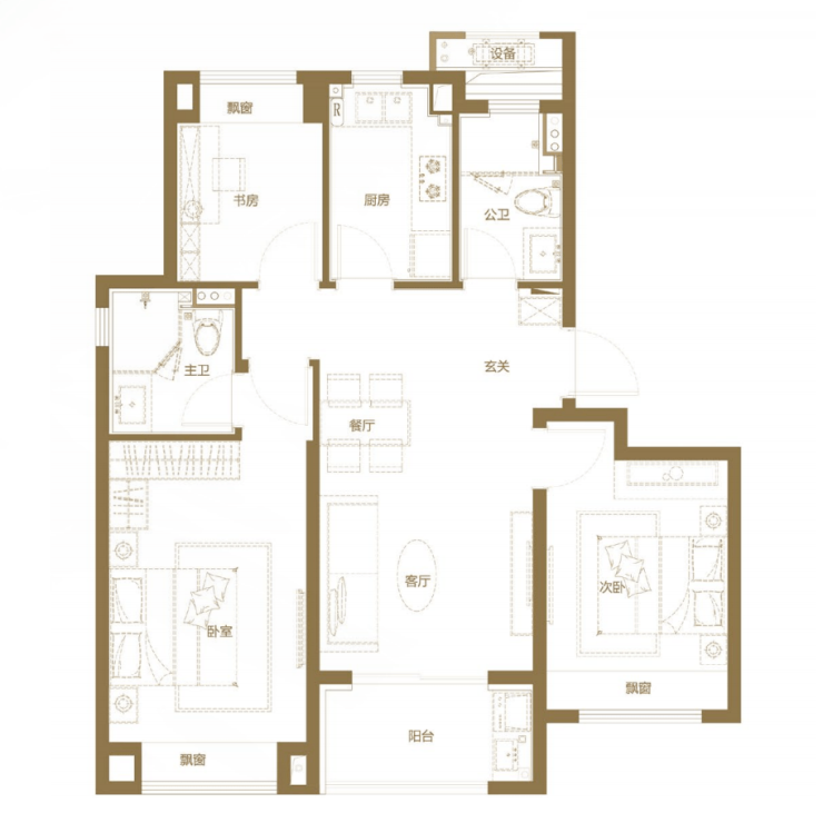 建面约128㎡四房户型,居住空间相对更为宽阔,主卧套房设计,自带卫生间,私密性和舒适度兼备。