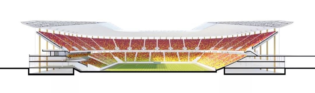 新球场采用两层看台的布置,能较大化的区分不同位置的观众流线,并优化观众的观赛体验。
