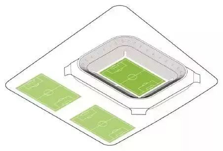 足球场整体沿南北向布置(北偏西15°),主球场西侧设置两片室外训练场,形成中轴方正、平整对称的格局,仪式感入场氛围由此而生。