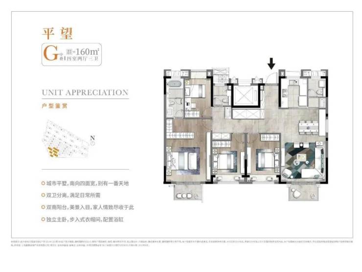 免责提示:此为金地丰盛道项目G户型(15-44-801室)标准户型示意图,建筑面积约160㎡。相同户型因楼栋、楼层、朝向等的不同,其立面设计、内部结构、管线管井布置、建筑面积等亦有不同。本户型图不作为要约或承诺,仅供装修参考示意,并非实际交付标准,房屋交付标准以双方签署的购房合同为准。本户型图相关功能区仅供展示,存在因政府规划变更或特殊户型而导致的差异。