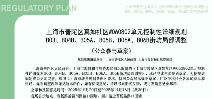 近日,普陀区官网公布了真如社区W060802单元B03、B04B、B05A、B05B、B06A、B06B街坊的控制性详细规划调整草案。根据草案,该区域将新增两宗住宅用地,总体量超过18万平方米,并配套规划一宗商业商办混合用地。