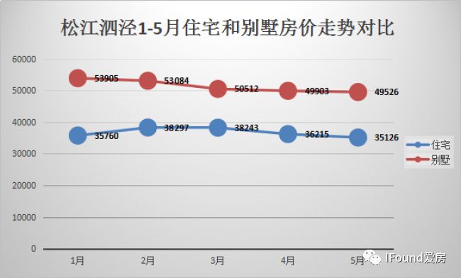 图为松江泗泾1-5月别墅和住宅一手房房价走势对比