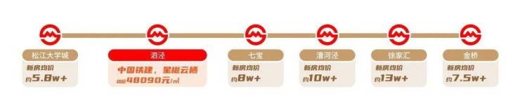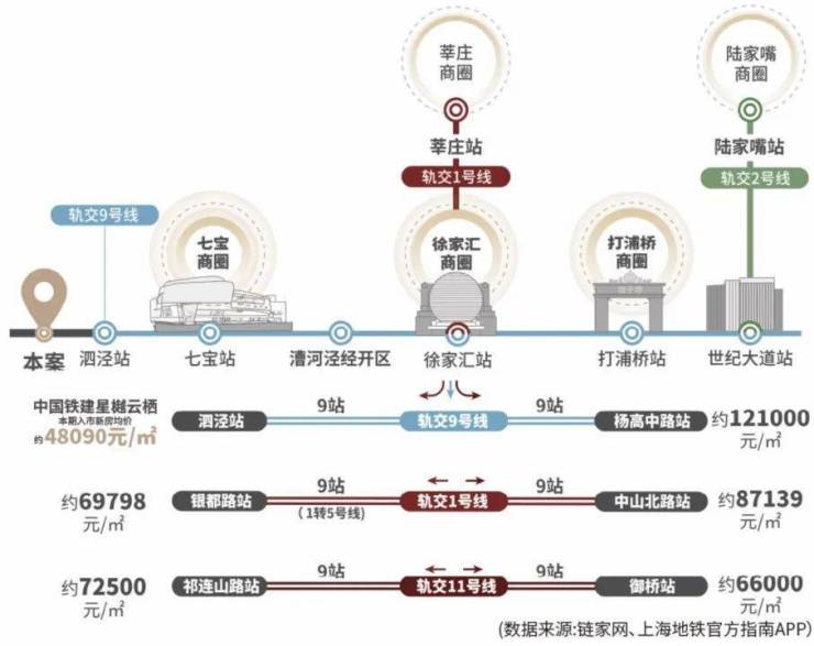 对比同样的轨交盘,沿着9号线会发现仅仅相隔3站地铁的七宝新房均价约8W+/㎡;相差6站地铁的漕河泾新房均价约10W+/㎡;相差9站地铁的徐家汇新房均价约13W+/㎡!