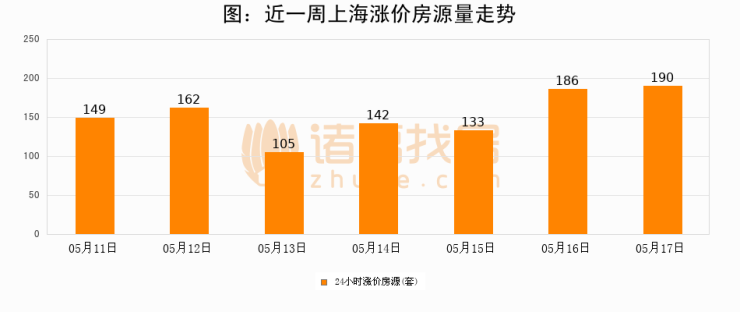 根据诸葛找房数据显示,上海24小时涨价房源量为190套,较05月16日增加4套,环比上涨2.2%。与此同时,涨价房源占比小幅扩大,业主信心有所提升。
