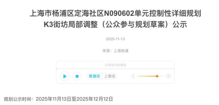 11月13日,杨浦区规划和自然资源局公示《上海市杨浦区定海社区N090602单元控制性详细规划K3街坊局部调整(公众参与规划草案)》,标志着备受关注的复旦大学附属中学国际部滨江新校区及配套学校建设项目进入实质性规划阶段。