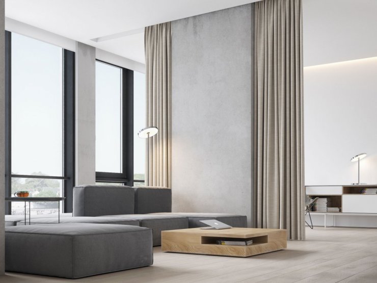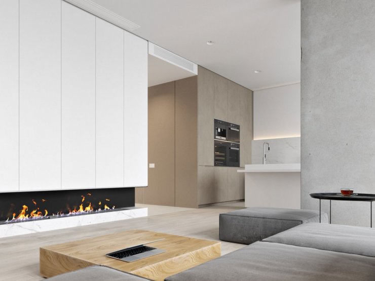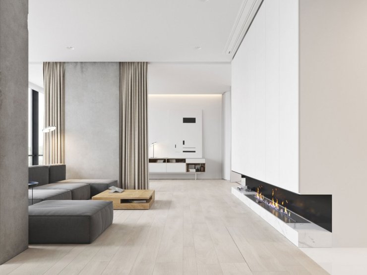 以白色调为基底,搭配浅灰色的沙发,窗帘。在良好的采光下营造出透亮,洁净的视觉感受,温润的木质茶几,熊熊燃烧的炉火成为温暖空间的元素。