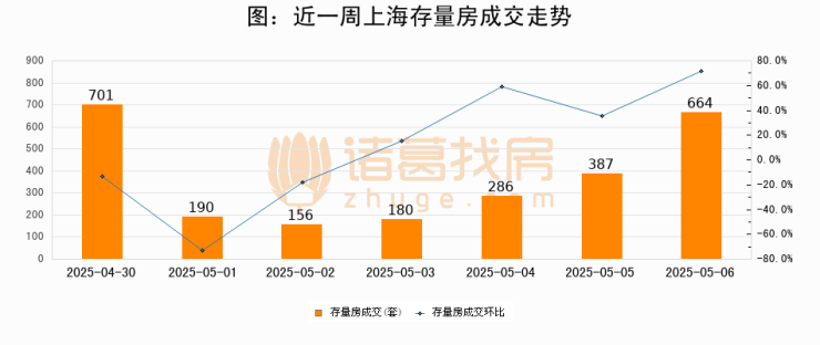 从存量房来看,2025年05月06日上海存量房单日成交664套,比昨日增加277套,环比上涨71.6%。从近一周存量房成交来看,上海存量房日均成交套数为366套,05月06日单日成交664套,高于近一周平均水平81.4%。