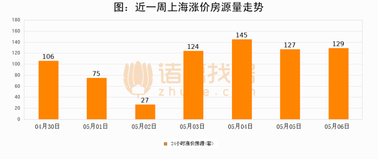 根据诸葛找房数据显示,上海24小时涨价房源量为129套,较05月05日增加2套,环比上涨1.6%。与此同时,涨价房源占比小幅扩大,业主信心有所提升。
