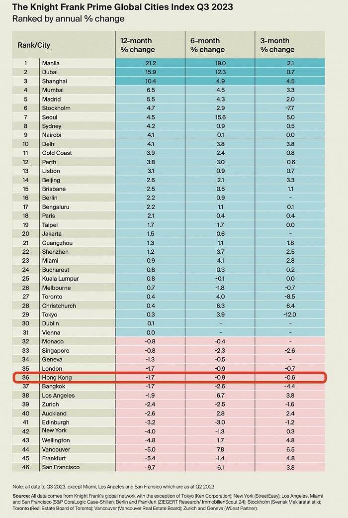 但香港豪宅楼价却在持续下跌,第三季度较二季度楼价按年下跌0.6%;若以截至今年9月底的12个月来算,按年跌幅达到了1.7%,全球排名第36位。