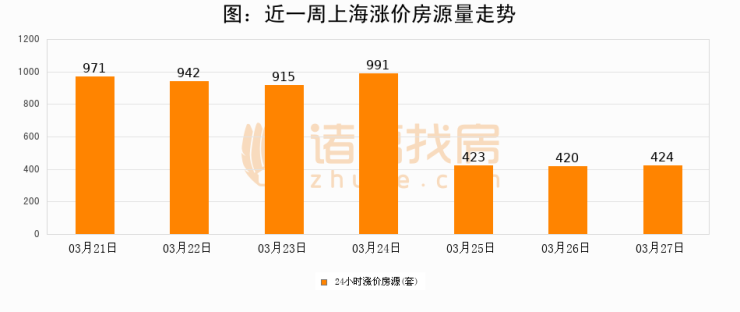 根据诸葛找房数据显示,上海24小时涨价房源量为424套,较03月26日增加4套,环比上涨1%。与此同时,涨价房源占比小幅扩大,业主信心有所提升。