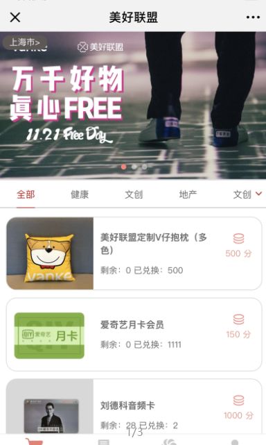 作为万科商业的消费者,笔者尝试着注册了美好联盟,积分不仅可以兑换万科各大业务的周边、产品,还可以兑换视频网站会员、电影兑换券、展览门票、运动健身卡等,这些品牌或产品都已成为了万科的“美好盟友”。