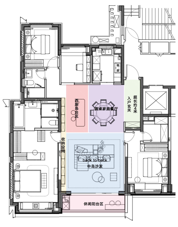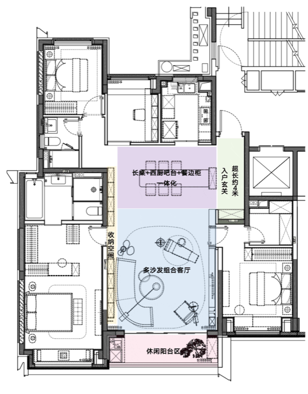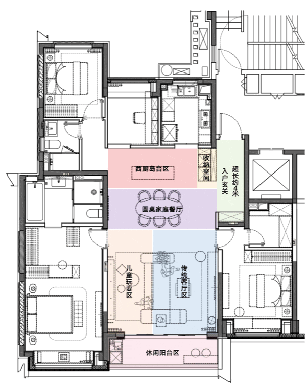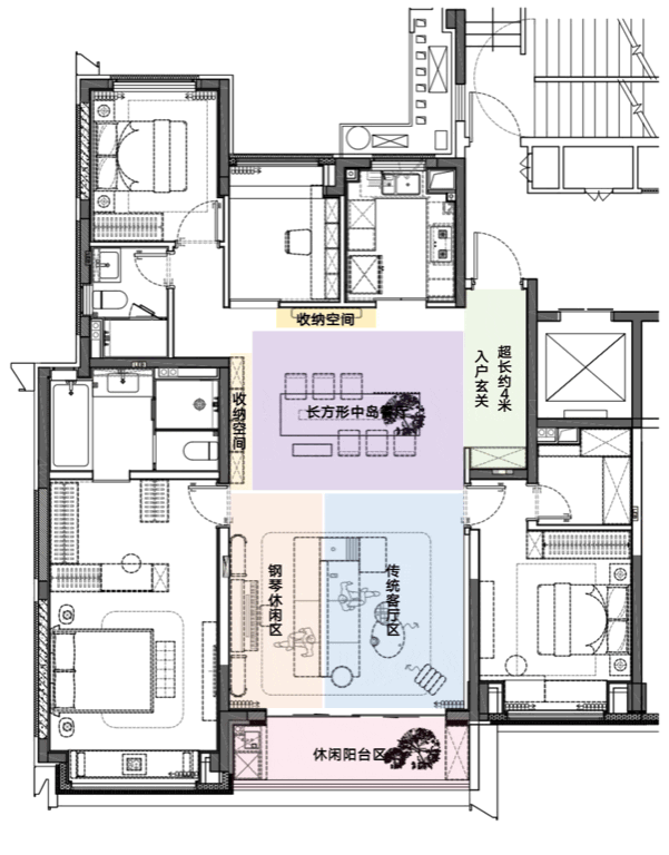 进深4米超长玄关过道设置,增加日常归家的仪式感,同时也提供一定的过渡功能。