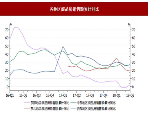 2015 年至 2017 年,是城市需求热度从东部向中西部蔓延的过程,三四线城市销售也高歌猛进,成交创历史新高。而进入 2018 年后,这种热度蔓延的趋势进一步扩散、 进一步下沉,但增速呈现放缓。前 4 月全国商品房销售面积仅同比增长 1.3%, 4 月单月同比增速已转为负增长。分结构来看,增速下滑的主要原因是东部尤其是三四线城市开始面临增速回落。