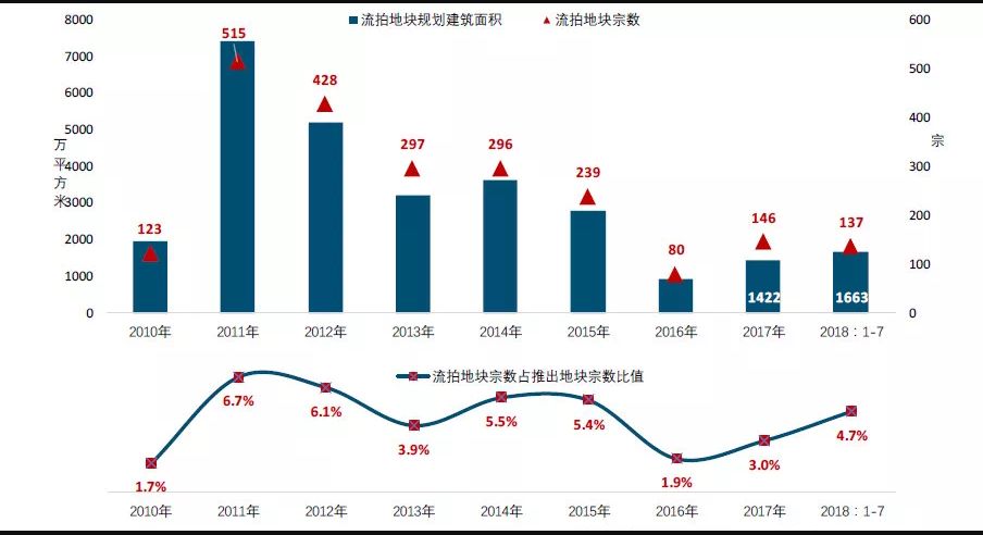 今年以来土地流拍加快根据中国指数研究院对百城土地公开招拍挂市场的监测,2010年至今年7月,全国百城共成交4.2万余宗住宅用地,总规划建筑面积约50亿平方米;共流拍两千余宗住宅用地,总规划建筑面积2.8亿平方米,其中2018年1-7月流拍地块总规划建筑面积1663万平方米,约是2017年全年流拍地块总规划建筑面积的1.2倍。已经达到了远高于2014年的4%达到了历史峰值6%。