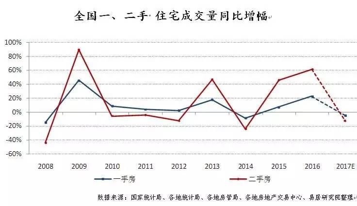 从图中可见在2008年和2013年前后出现了两次明显的二手房销售增幅大于一手房,而在几个房价高速上涨的阶段一手房交易量也是远远高于二手房交易量,这很大程度的反应了房价变化。