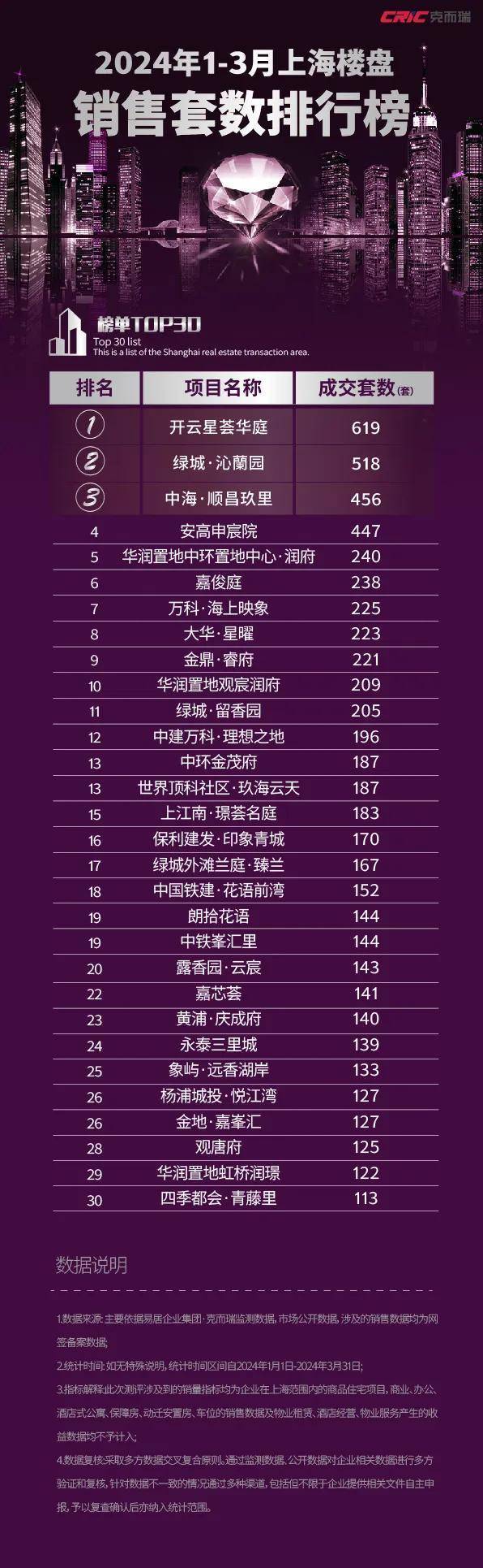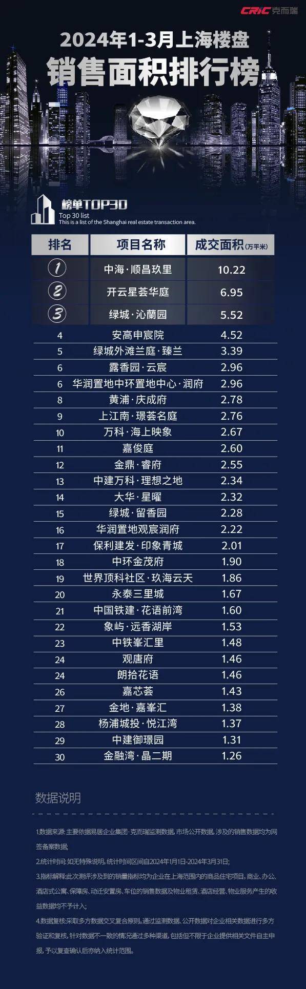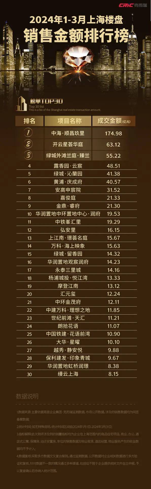 2024年1-3月上海楼盘销售TOP30排行榜 中海顺昌玖里稳霸榜首