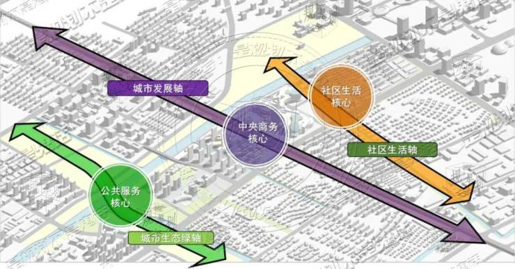 梅陇新中心的整体规划结构:“三轴三心”。