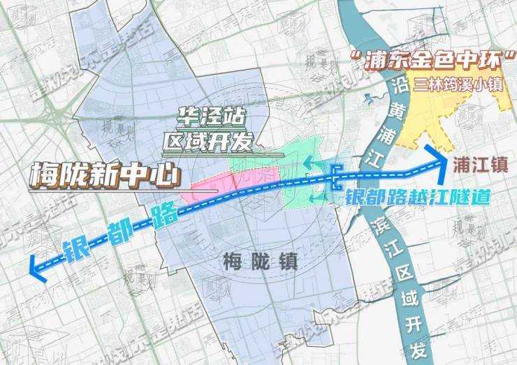 银都路,东西向贯穿梅陇镇,自梅陇新中心向东,依次经过华泾站区域开发,未来北侧将成为又一个商办集聚区,南侧将建大面积的绿地公园;再经过沿黄浦江的滨江区域开发,未来落后的工业厂房将搬迁成为研发产业和公共绿地;未来随着越江隧道的建成通车,直达对岸的浦江镇和浦东三林筠溪小镇,也就是浦东“金色中环”的五大潜力地区之一。