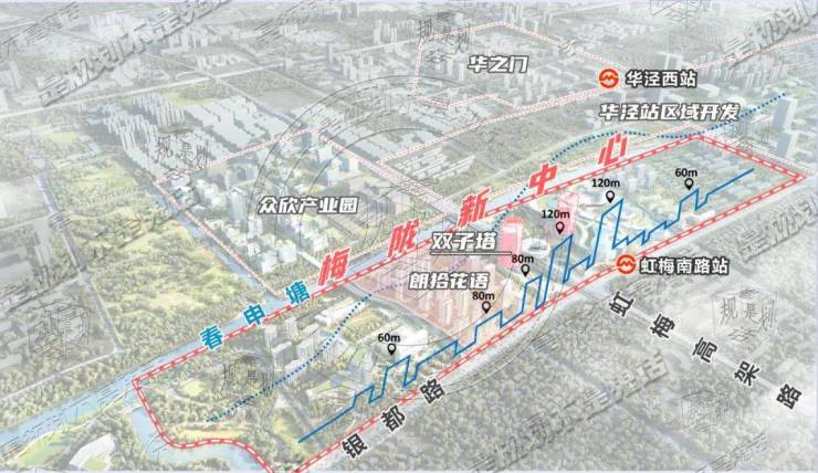 为更好的提升地区形象,塑造区域地标,在轨交站点周边地块内(虹梅南路两侧)布局地标双子塔建筑,高度为120米,形成“梅陇门户”。