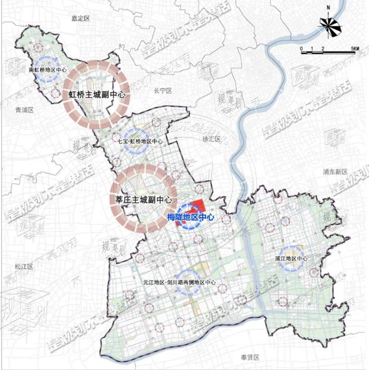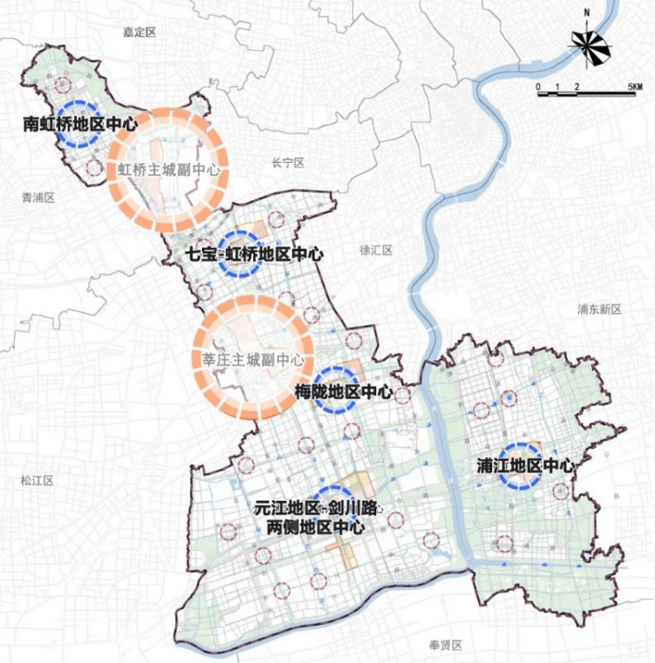 在公示的《闵行区2035总体规划》中,闵行区总共有五大地区中心:南虹桥地区中心、七宝-虹桥地区中心、梅陇地区中心、浦江地区中心和元江路-剑川路地区中心。
