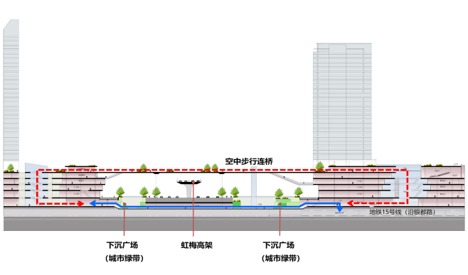 在虹梅南路两侧,通过采用空中连廊、地下通道、建筑对称布局等多层次的立体交通连接周边商业商办地块,构建成一个枢纽型城市核心区。