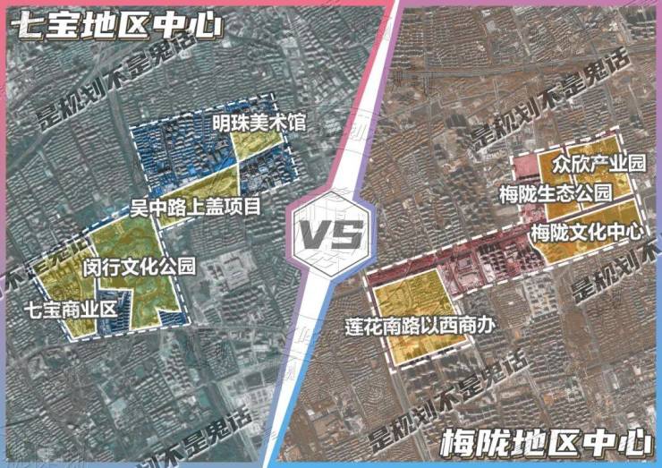 为了更直观地向大家解释规划“地区中心”的发展能级,我们就以七宝为例,对比一下:梅陇地区中心和七宝-虹桥地区中心的详细规划。