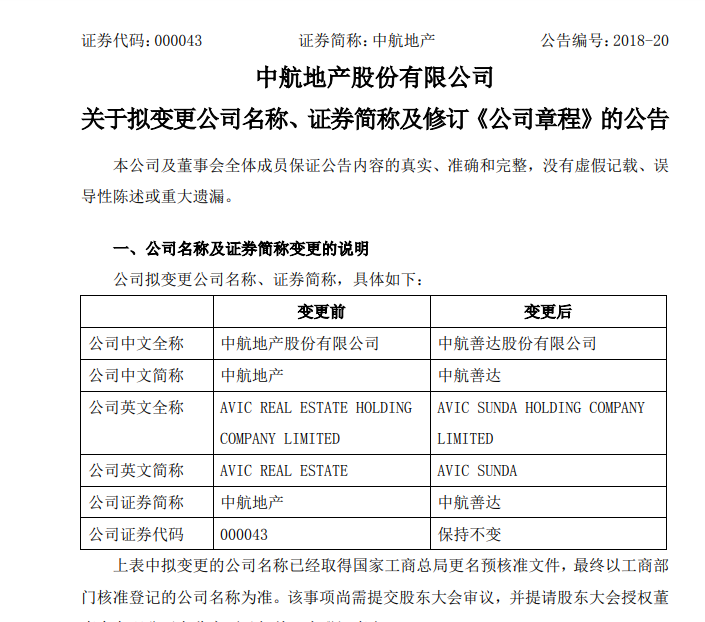 5月11日晚间,中航地产发布更名公告称,鉴于公司实施重大资产重组,主营业务已发生变更,未来公司战略将聚焦物业资产管理业务,董事会同意将公司名称由“中航地产股份有限公司”拟变更为“中航善达股份有限公司”。