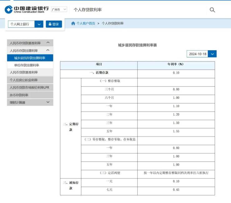 ▲10月18日早上,建设银行网站已下调挂牌人民币存款利率