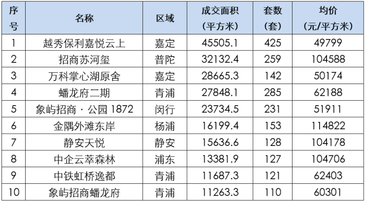从成交产品来看,中高端产品为主的大格局未变。从成交前十榜单中看出,有4个10万+产品,其余均为3-6万元/平方米的首次改善项目。板块上有3个徐泾板块的项目,大虹桥概念持续火热。总体来看,地段决定项目热销程度,榜单中东外滩、三林都是改善需求关注度相当高的地方。另外值得关注的是,当期上榜产品签约都超过百套,也是历史上第一次看到这种现象。