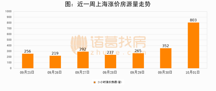 根据诸葛找房数据显示,上海24小时涨价房源量为803套,较09月30日增加451套,环比上涨128.1%。与此同时,涨价房源占比小幅扩大,业主信心有所提升。
